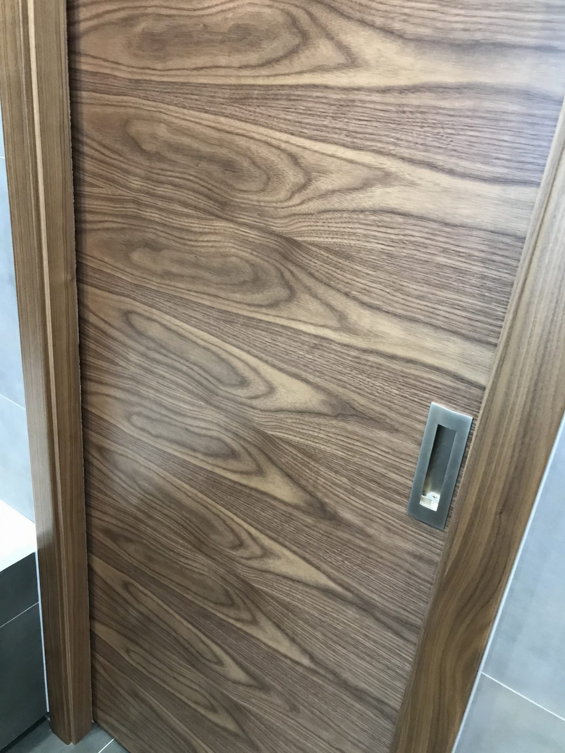 Přírodní dřevěná dýha v dekoru ořech, v kombinaci se skrytými panty a efektním nadsvětlíkem. Ze starého domu vznikl zcela moderní domov.